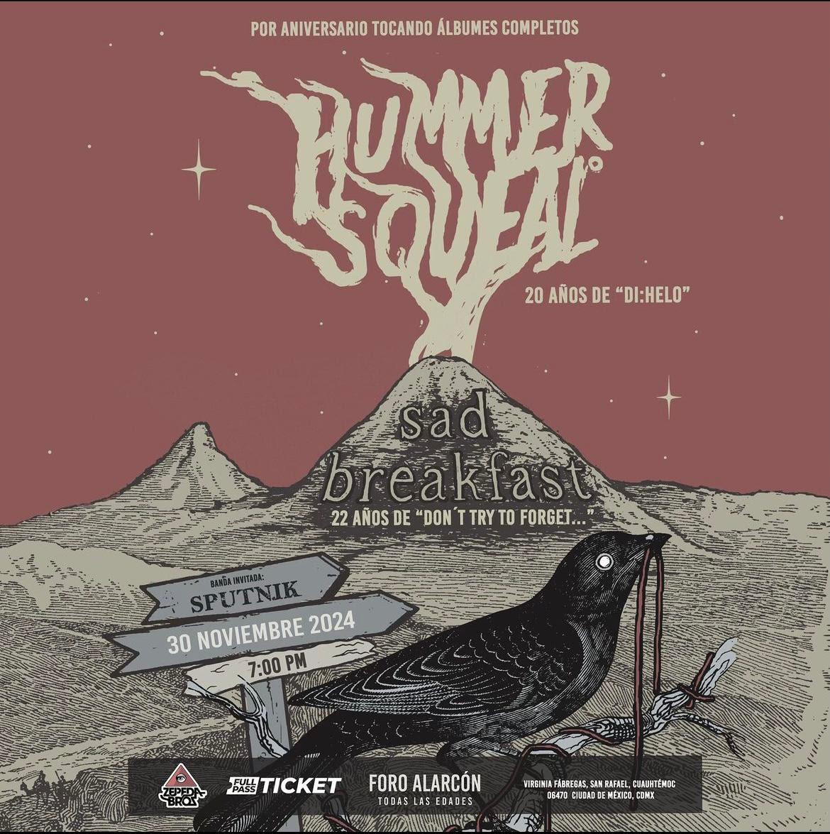 Pues, en esta ocasión, y para calentar motores para este fin de año, el día 28 de noviembre de este año, de la mano de Zepeda Bros, la nostalgia y el merol se harán presente en el Foro Alarcón, donde nos pondremos de gala para recibir a HummerSqueal, Sad Breakfast y como invitados especiales Sputnik.